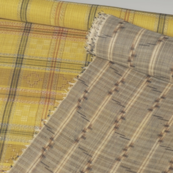 Originating around the 13th century, Kijoka Banana Fiber Cloth is made by hand-spinning thread taken from the bark of the ito bashō variety of banana tree, ikat thread is hand bundled, dyed in plant dyes made from the Strobilanthes cusia or Rhaphiolepis umbellata plants, and then woven into cloth. This style of weaving is unique to Okinawa and has been loved by people since long ago for its light, smooth texture.